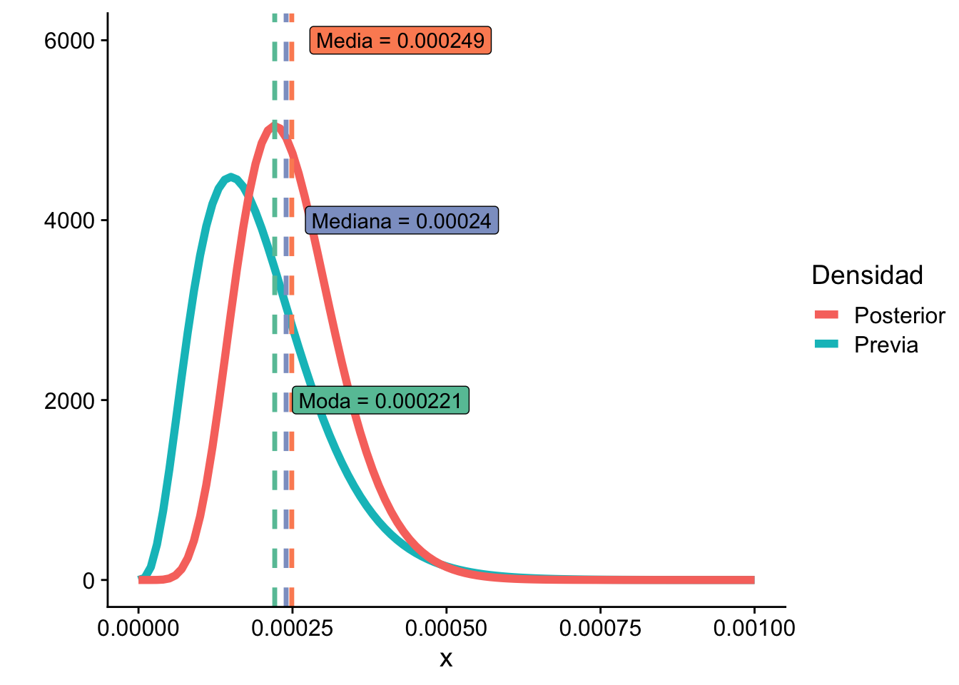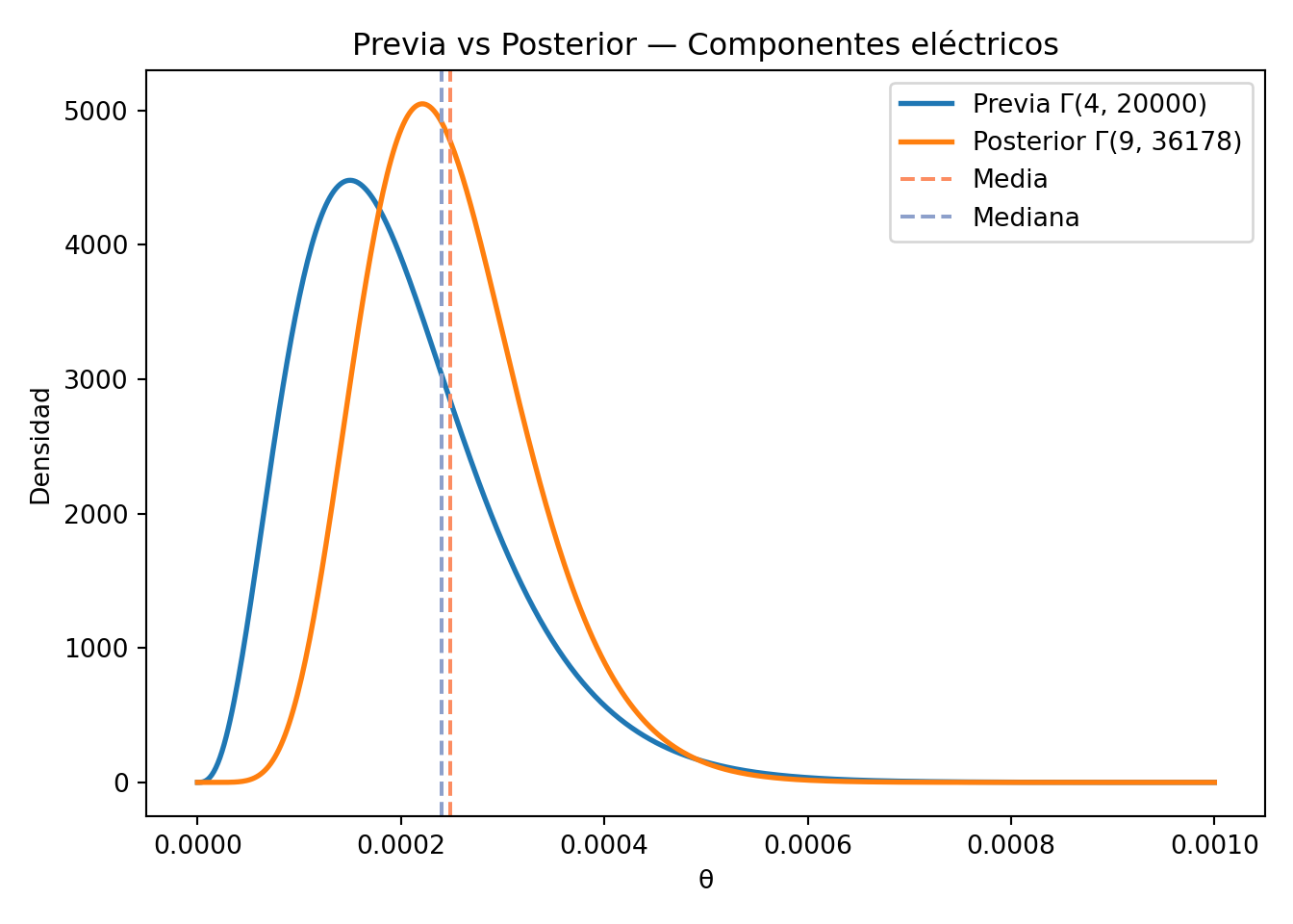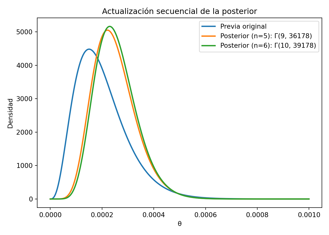 from scipy.stats import gamma as gamma_distfrom scipy.optimize import minimize_scalarimport numpy as npalpha_py =9beta_py =36178# Pérdida cuadrática: media posteriortheta_media_py = alpha_py / beta_pyprint(f"Media posterior (pérdida cuadrática): θ = {theta_media_py:.6f} → 1/θ = {1/ theta_media_py:.1f} unidades")