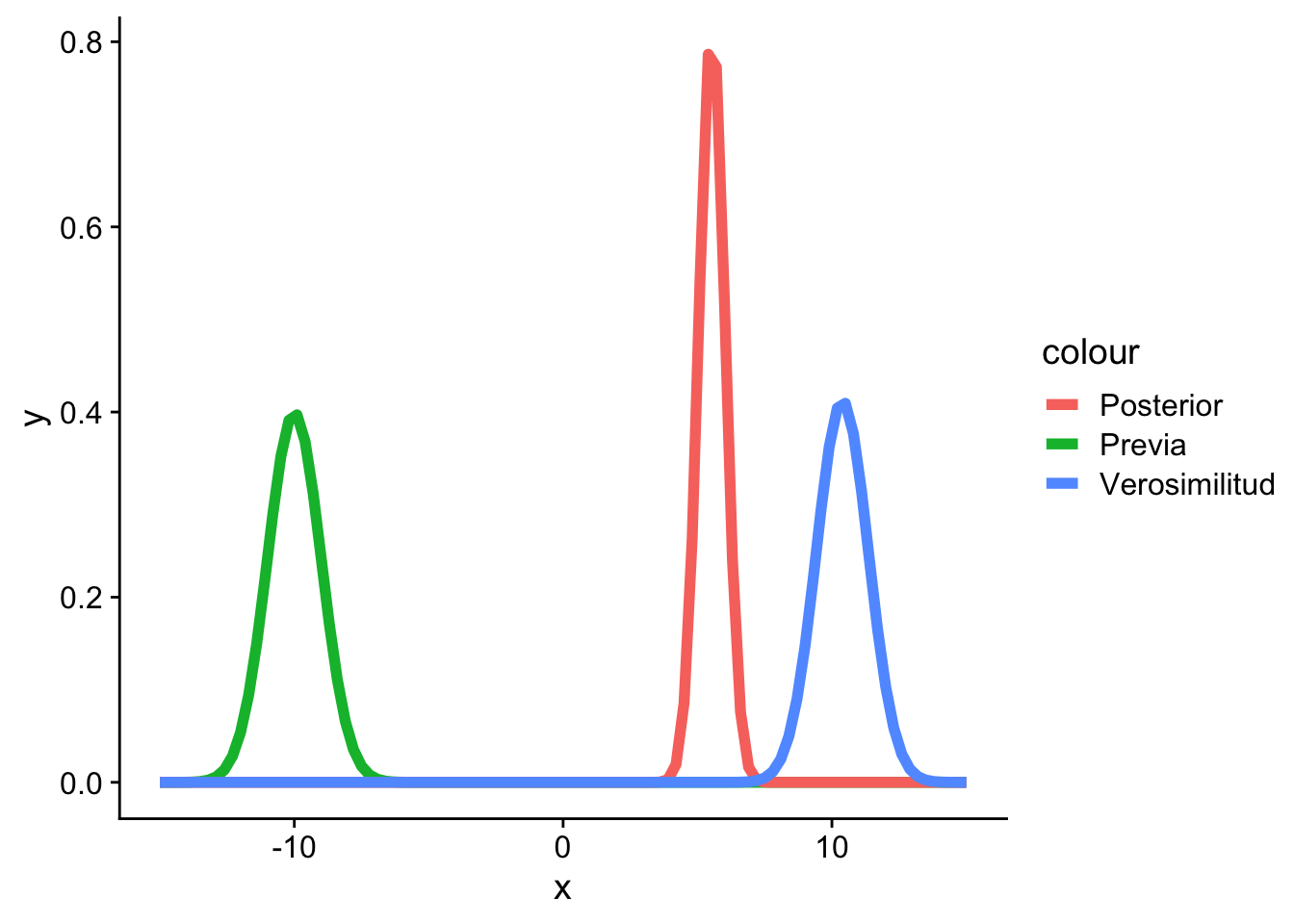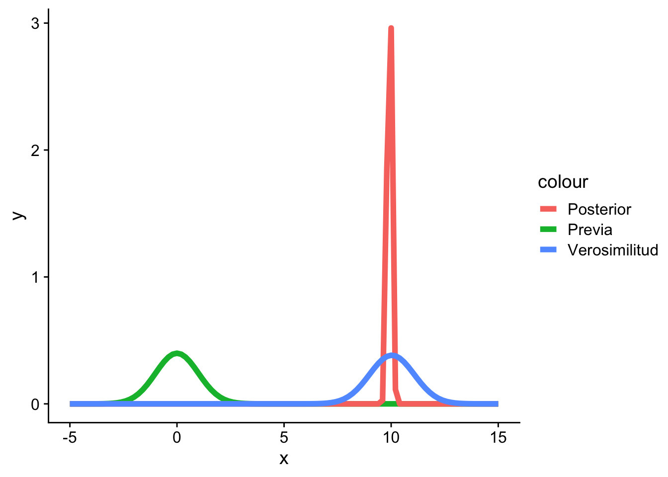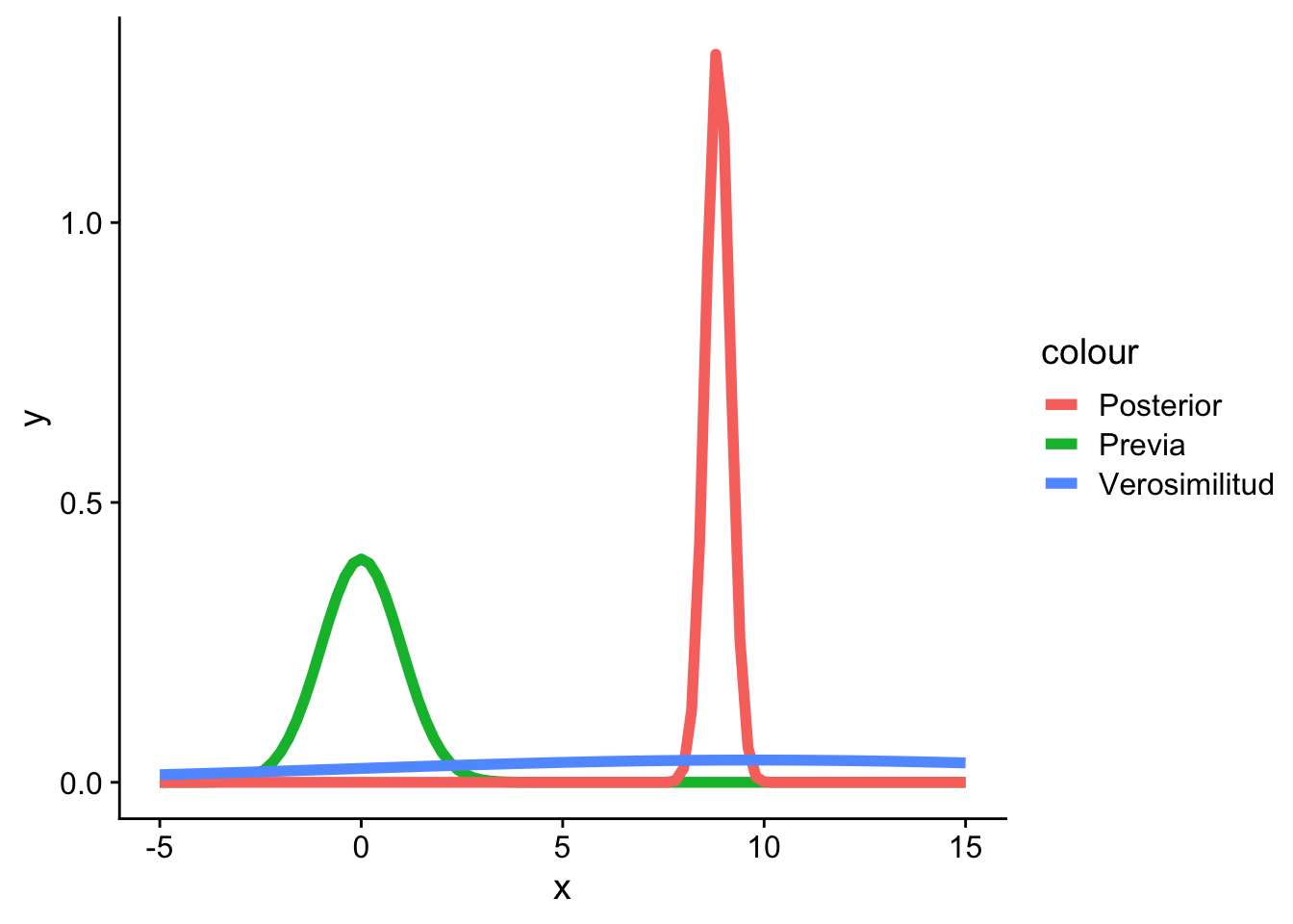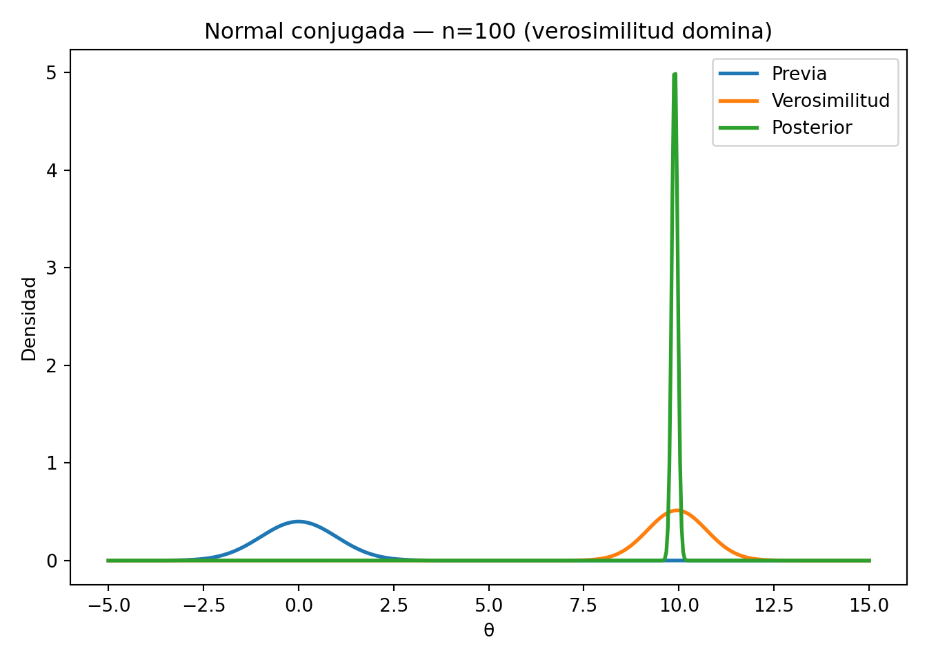 La posterior combina lo que sabíamos antes de ver los datos (previa) con la información aportada por los datos (verosimilitud). Cuantos más datos tengamos, menor será la influencia de la previa.