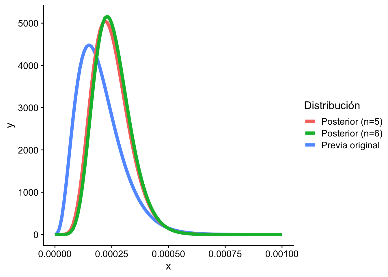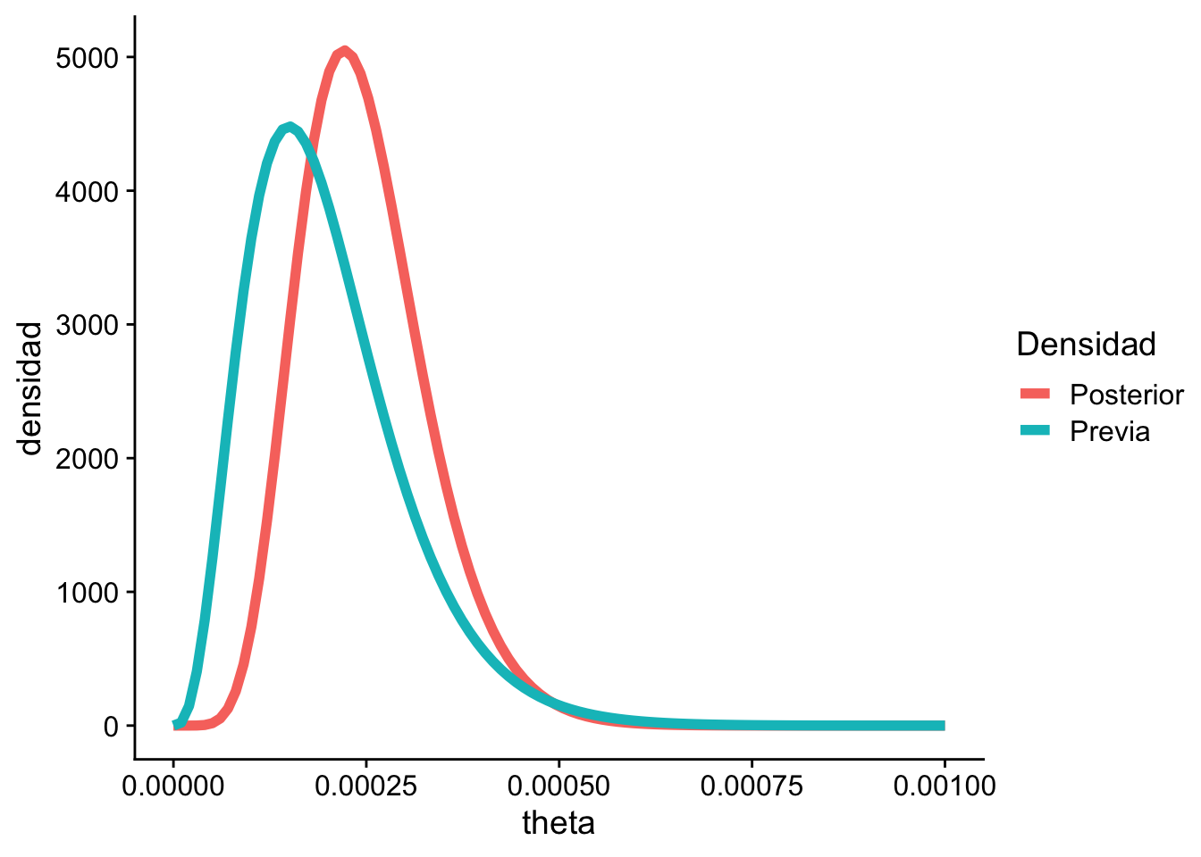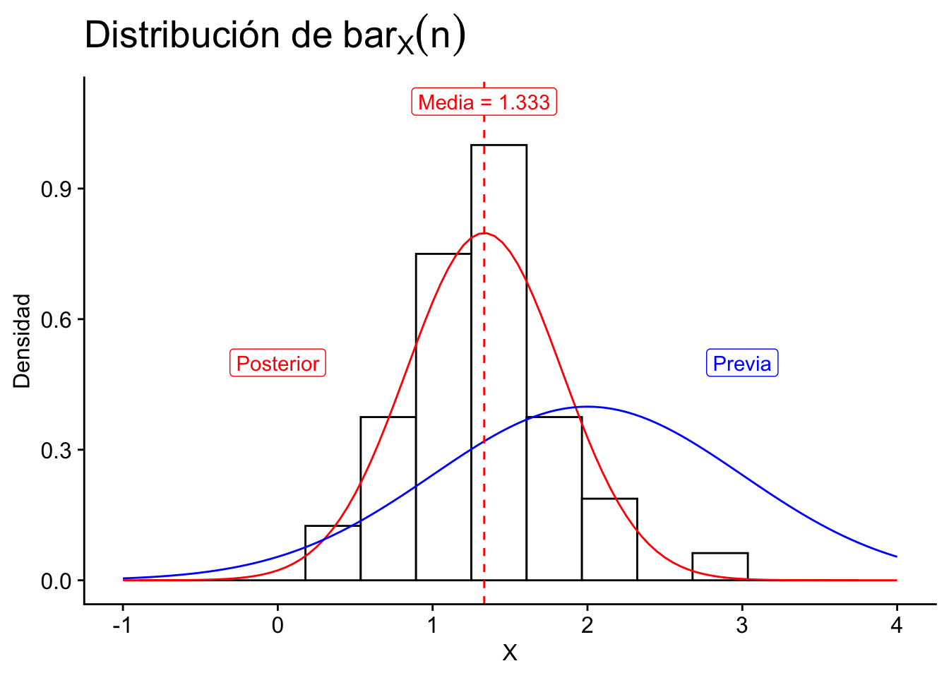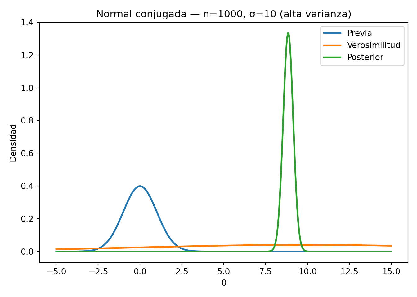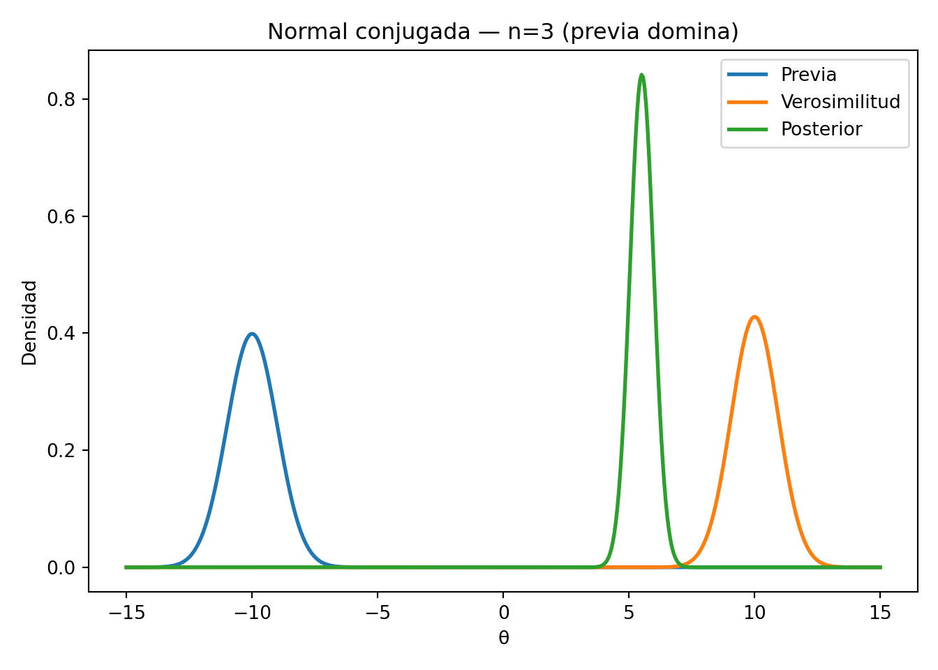 La posterior combina lo que sabíamos antes de ver los datos (previa) con la información aportada por los datos (verosimilitud). Cuantos más datos tengamos, menor será la influencia de la previa.