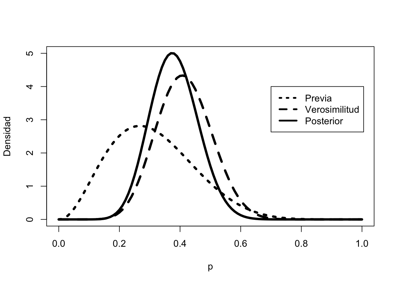 curve(dbeta(x, a + s, b + f),from =0,to =1,xlab ="p",ylab ="Densidad",lty =1,lwd =4)curve(dbeta(x, s +1, f +1), add =TRUE, lty =2, lwd =4)curve(dbeta(x, a, b), add =TRUE, lty =3, lwd =4)legend( .7,4,c("Previa", "Verosimilitud", "Posterior"),lty =c(3, 2, 1),lwd =c(3, 3, 3))