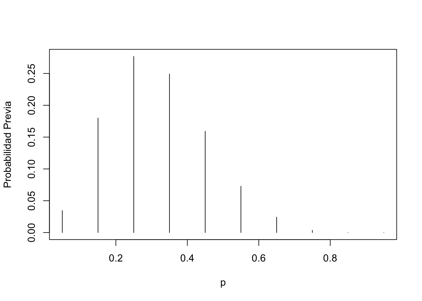 p <-seq(0.05, 0.95, by =0.1)prior <-c(1, 5.2, 8, 7.2, 4.6, 2.1, 0.7, 0.1, 0, 0)prior <- prior /sum(prior)plot(p, prior, type ="h", ylab ="Probabilidad Previa")