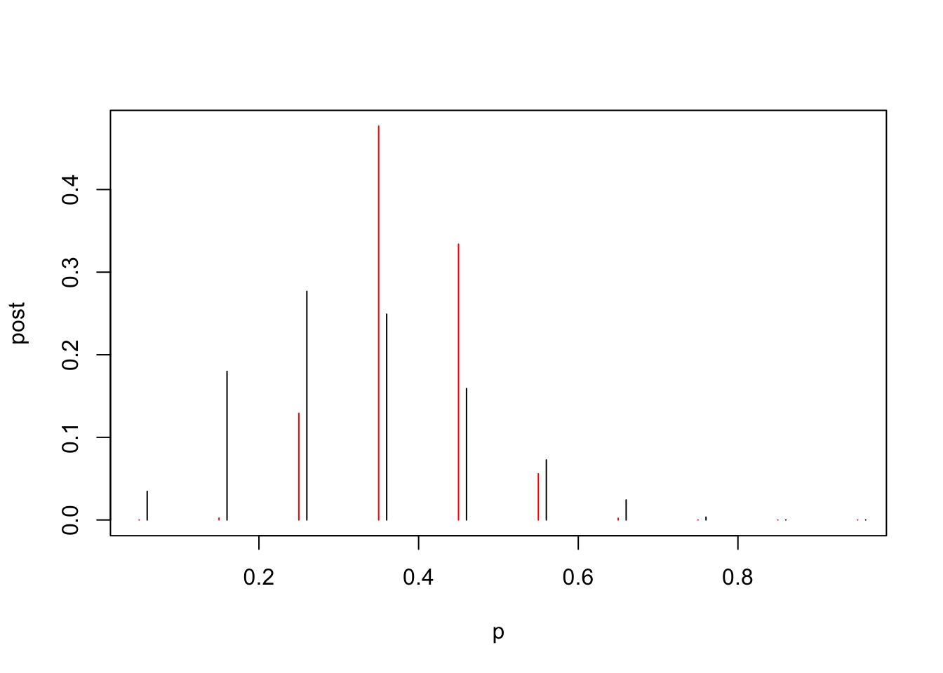 data <-c(11, 16)post <-pdisc(p, prior, data)round(cbind(p, prior, post), 2)