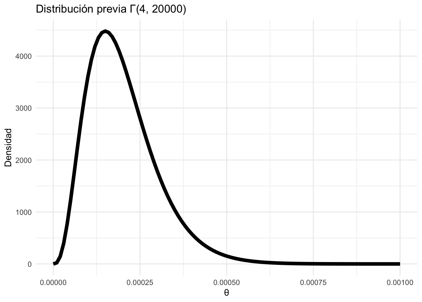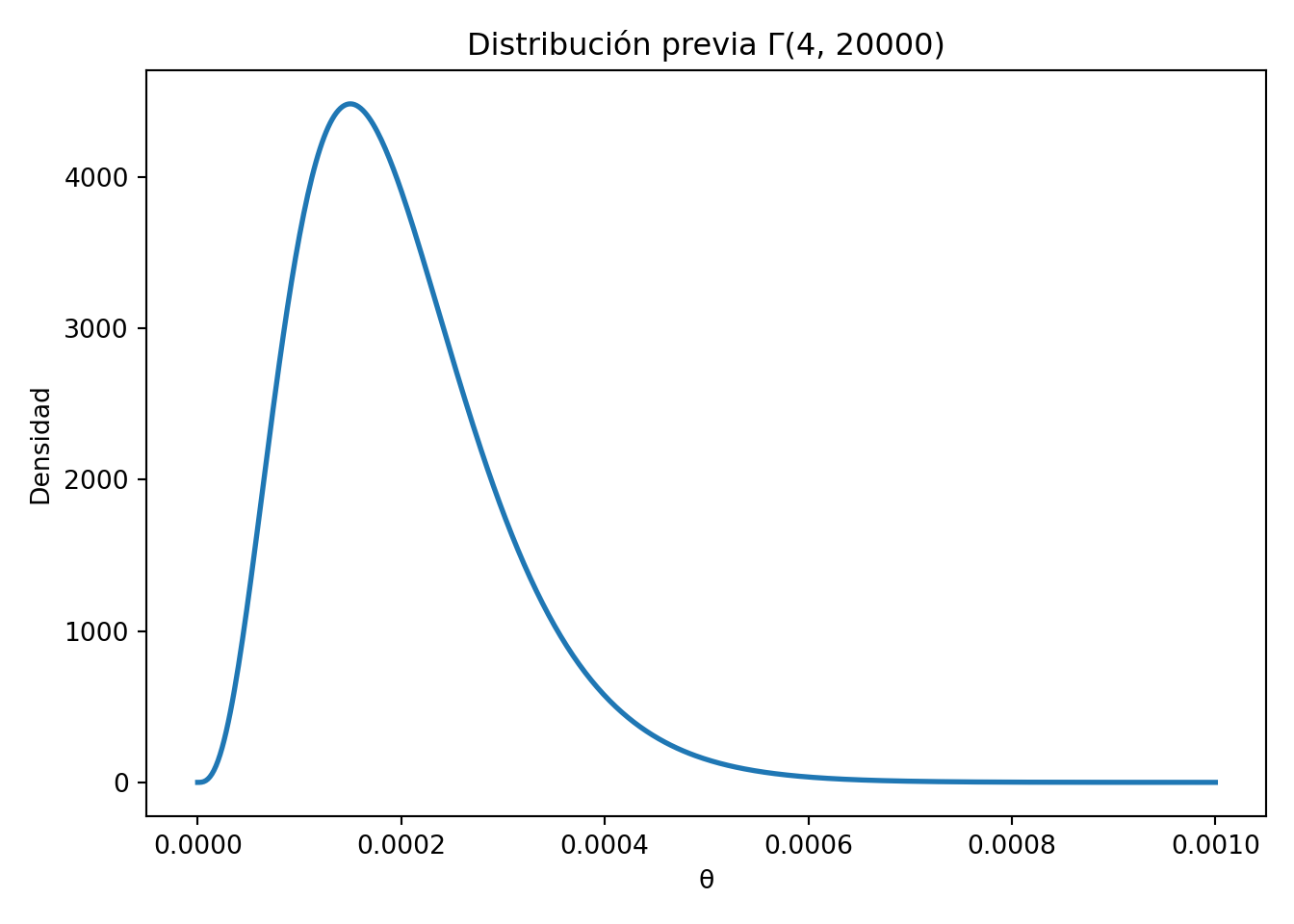 Si suponemos que \(\theta\) es una variable aleatoria que sigue una distribución Gamma con parámetros \(\alpha = 1\) y \(\beta = 2\), entonces la densidad previa de \(\theta\) es:
