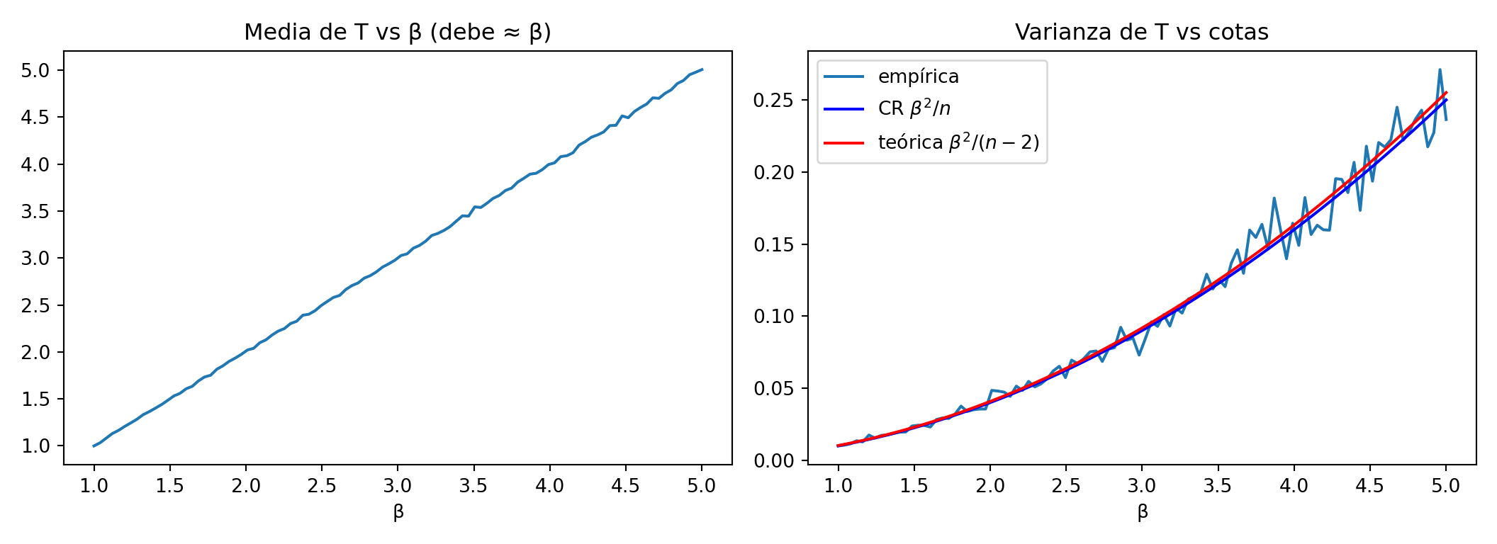 import numpy as npimport matplotlib.pyplot as plt# T = (n-1)/sum(X_i): insesgado de β, pero Var(T) = β²/(n-2) > β²/n (cota CR)estimador1_py = np.array([(n_cr -1) / m.sum(axis=1) for m in lista_muestras_py]).Tfig, axes = plt.subplots(1, 2, figsize=(11, 4))axes[0].plot(beta_vals, estimador1_py.mean(axis=0))axes[0].set_xlabel("β"); axes[0].set_title("Media de T vs β (debe ≈ β)")axes[1].plot(beta_vals, estimador1_py.var(axis=0, ddof=1), label="empírica")axes[1].plot(beta_vals, beta_vals**2/ n_cr, color="blue", label=r"CR $\beta^2/n$")axes[1].plot(beta_vals, beta_vals**2/ (n_cr -2), color="red", label=r"teórica $\beta^2/(n-2)$")axes[1].set_xlabel("β"); axes[1].set_title("Varianza de T vs cotas")axes[1].legend()plt.tight_layout()plt.show()
