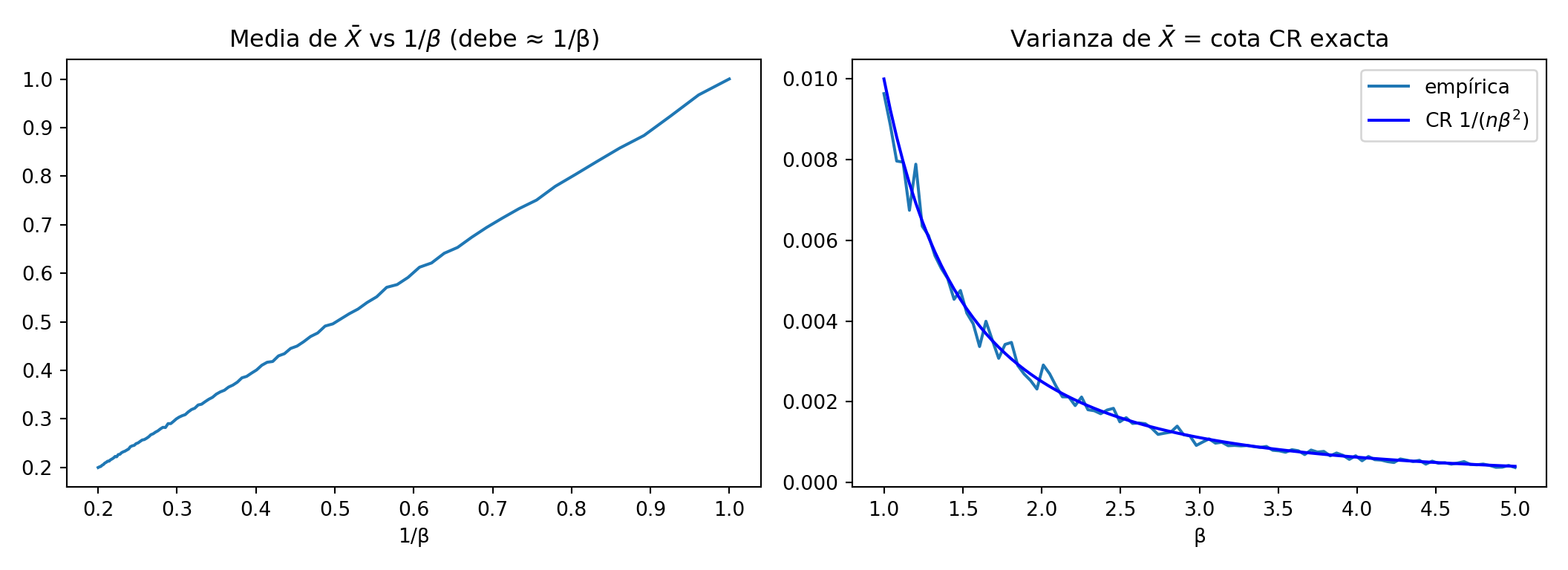 import numpy as npimport matplotlib.pyplot as plt# X̄_n: estimador eficiente de 1/β = m(β) — alcanza la cota CR exactamenteestimador2_py = np.array([m.mean(axis=1) for m in lista_muestras_py]).Tfig, axes = plt.subplots(1, 2, figsize=(11, 4))axes[0].plot(1/ beta_vals, estimador2_py.mean(axis=0))axes[0].set_xlabel("1/β"); axes[0].set_title(r"Media de $\bar{X}$ vs $1/\beta$(debe ≈ 1/β)")axes[1].plot(beta_vals, estimador2_py.var(axis=0, ddof=1), label="empírica")axes[1].plot(beta_vals, 1/ (n_cr * beta_vals**2), color="blue", label=r"CR $1/(n\beta^2)$")axes[1].set_xlabel("β"); axes[1].set_title(r"Varianza de $\bar{X}$ = cota CR exacta")axes[1].legend()plt.tight_layout()plt.show()