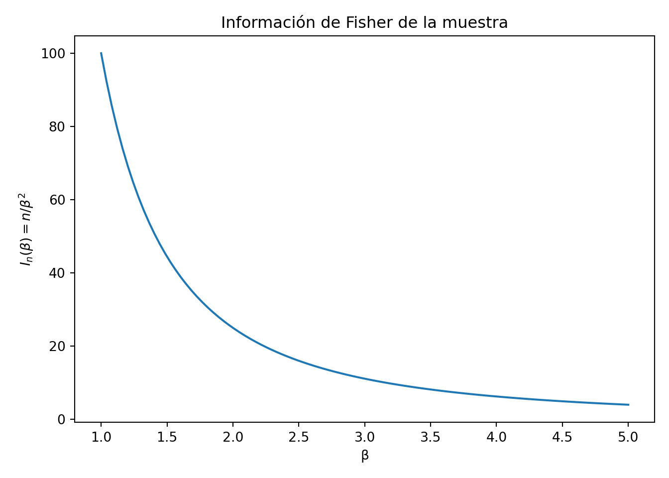 import numpy as npimport matplotlib.pyplot as pltrng_cr = np.random.default_rng(42)beta_vals = np.linspace(1, 5, 100)n_cr =100# Generar listas de muestras para cada valor de βlista_muestras_py = [rng_cr.exponential(scale=1/b, size=(500, n_cr)) for b in beta_vals]# I_n(β) = n/β² decrece cuando β creceplt.plot(beta_vals, n_cr / beta_vals**2)plt.xlabel("β")plt.ylabel(r"$I_n(\beta) = n/\beta^2$")plt.title("Información de Fisher de la muestra")plt.tight_layout()plt.show()