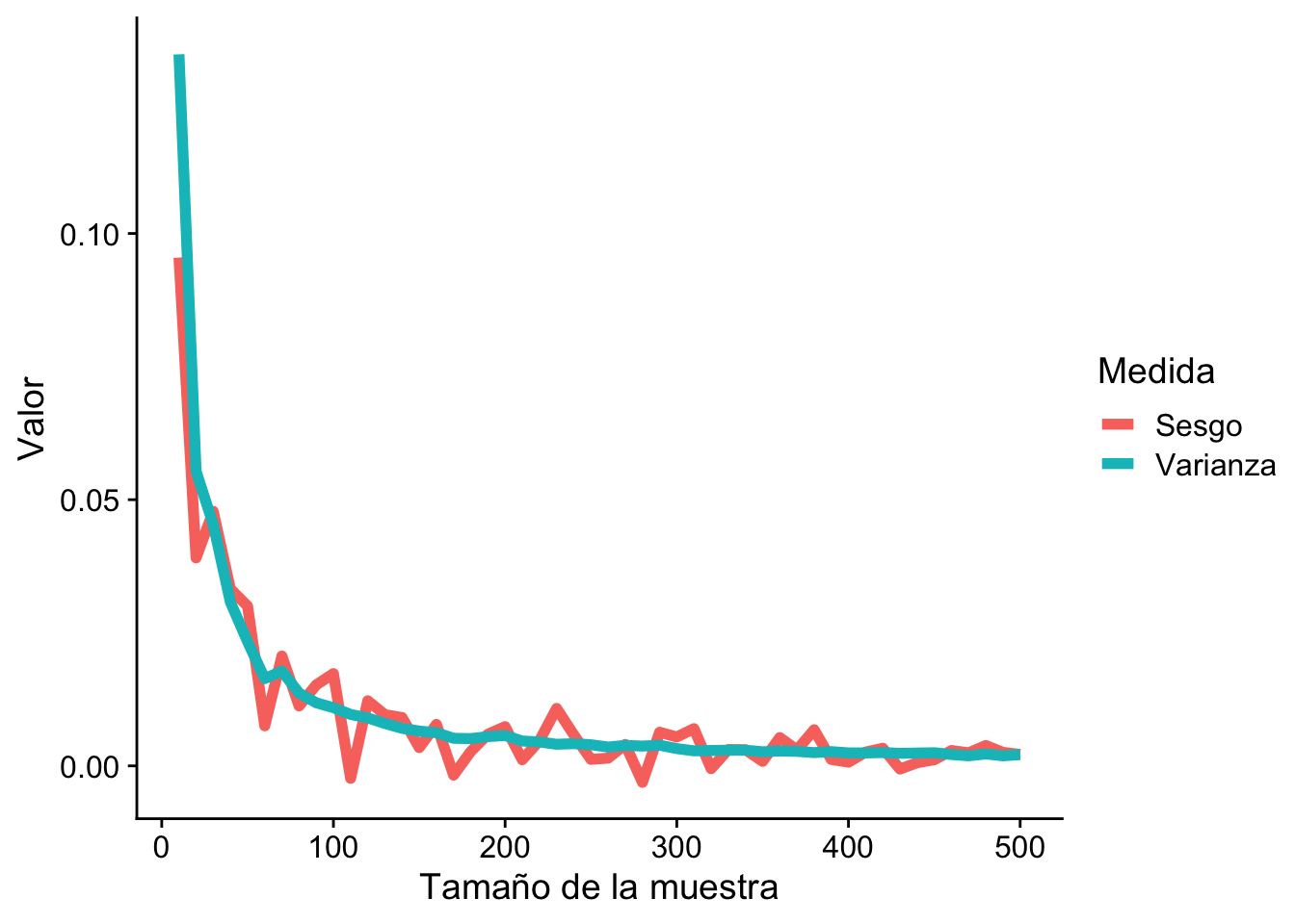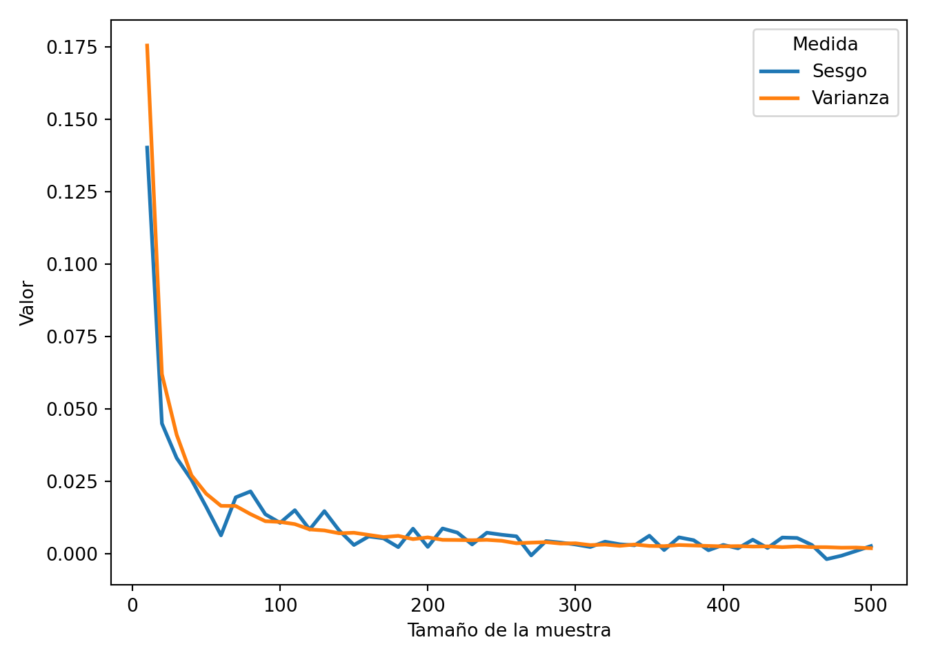 Graficaremos cómo varían el sesgo y la varianza con el tamaño de la muestra.