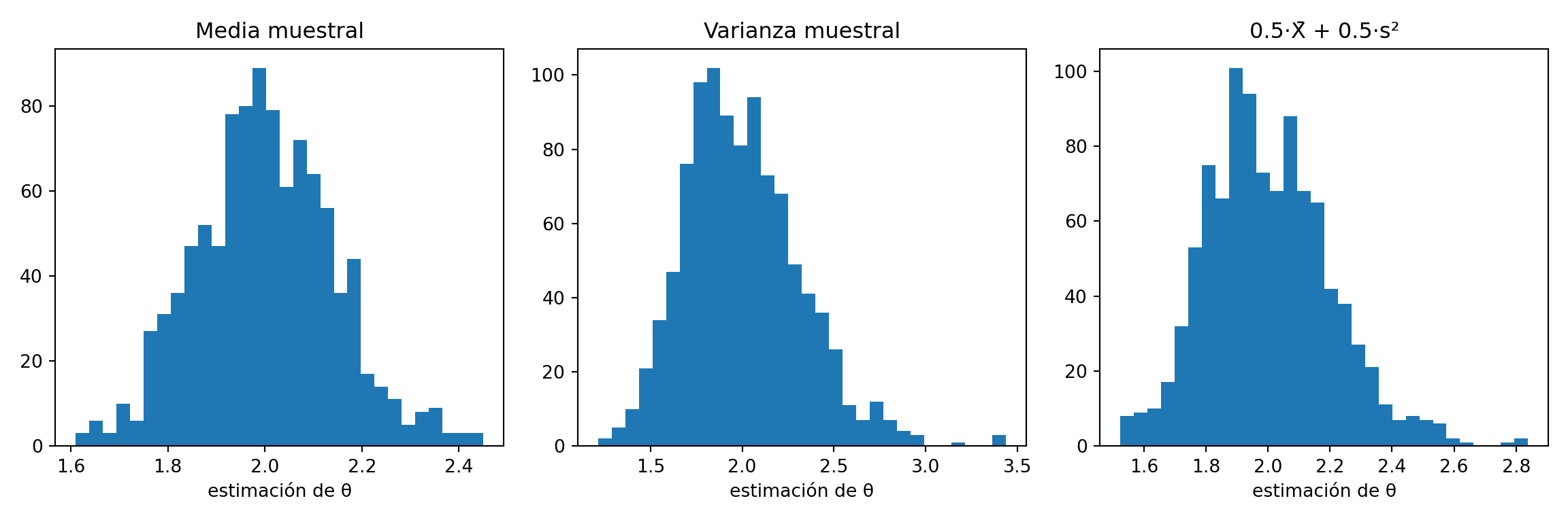 Observación. Bajo el enfoque bayesiano, si se asume la distribución a priori \(\theta \sim \text{Gamma}(1, 2)\) (forma, tasa) —equivalente a \(\theta \sim \text{Exponencial}(2)\)— y dado que \(T = \sum_{i=1}^{3}X_i \sim \text{Gamma}(3, \theta)\), la distribución posterior resulta ser \(\theta \mid T \sim \text{Gamma}(4, 2+T)\). El estimador de Bayes bajo pérdida cuadrática es la media posterior: \[
