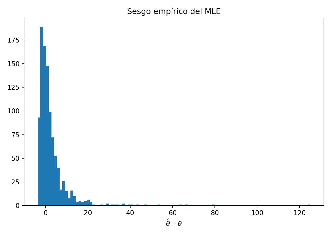 Con esto concluimos que el estimador de máxima verosimilitud no siempre es insesgado. Cabe mencionar que, aunque el MLE puede ser sesgado para muestras finitas, bajo condiciones de regularidad es consistente (converge en probabilidad al verdadero parámetro cuando \(n\to\infty\)) y asintóticamente insesgado (su sesgo tiende a cero). Estas son propiedades distintas: la consistencia es más fuerte que el insesgamiento asintótico.