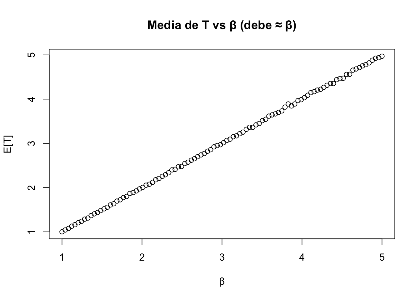 # T = (n-1)/sum(X_i): insesgado de β, pero Var(T) = β²/(n-2) > β²/n (cota CR)estimador1 <-sapply(X = lista_muestras,FUN =function(x) {apply(x, 1, function(xx) (n -1) /sum(xx)) })plot(beta, apply(X = estimador1, MARGIN =2, FUN = mean),xlab ="β", ylab ="E[T]", main ="Media de T vs β (debe ≈ β)")