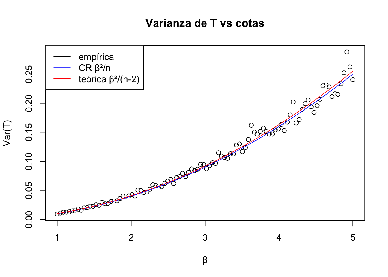 plot(beta, apply(X = estimador1, MARGIN =2, FUN = var),xlab ="β", ylab ="Var(T)", main ="Varianza de T vs cotas")lines(beta, beta^2/ n, col ="blue") # cota CR (no alcanzada)lines(beta, beta^2/ (n -2), col ="red") # varianza teórica reallegend("topleft", legend =c("empírica", "CR β²/n", "teórica β²/(n-2)"),col =c("black", "blue", "red"), lty =1)