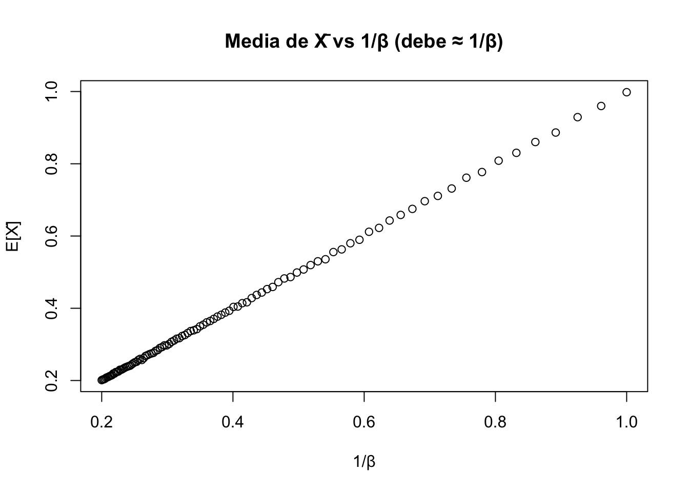 # X̄_n: estimador eficiente de 1/β = m(β) — alcanza la cota CR exactamenteestimador2 <-sapply(X = lista_muestras,FUN =function(x) {apply(x, 1, mean) })plot(1/ beta, apply(X = estimador2, MARGIN =2, FUN = mean),xlab ="1/β", ylab ="E[X̄]", main ="Media de X̄ vs 1/β (debe ≈ 1/β)")