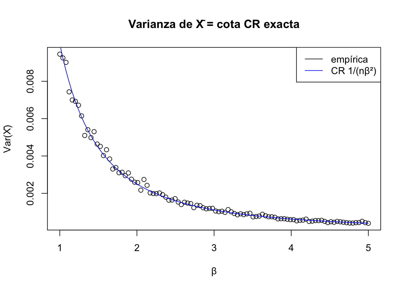 plot(beta, apply(X = estimador2, MARGIN =2, FUN = var),xlab ="β", ylab ="Var(X̄)", main ="Varianza de X̄ = cota CR exacta")lines(beta, 1/ (n * beta^2), col ="blue")legend("topright", legend =c("empírica", "CR 1/(nβ²)"),col =c("black", "blue"), lty =1)