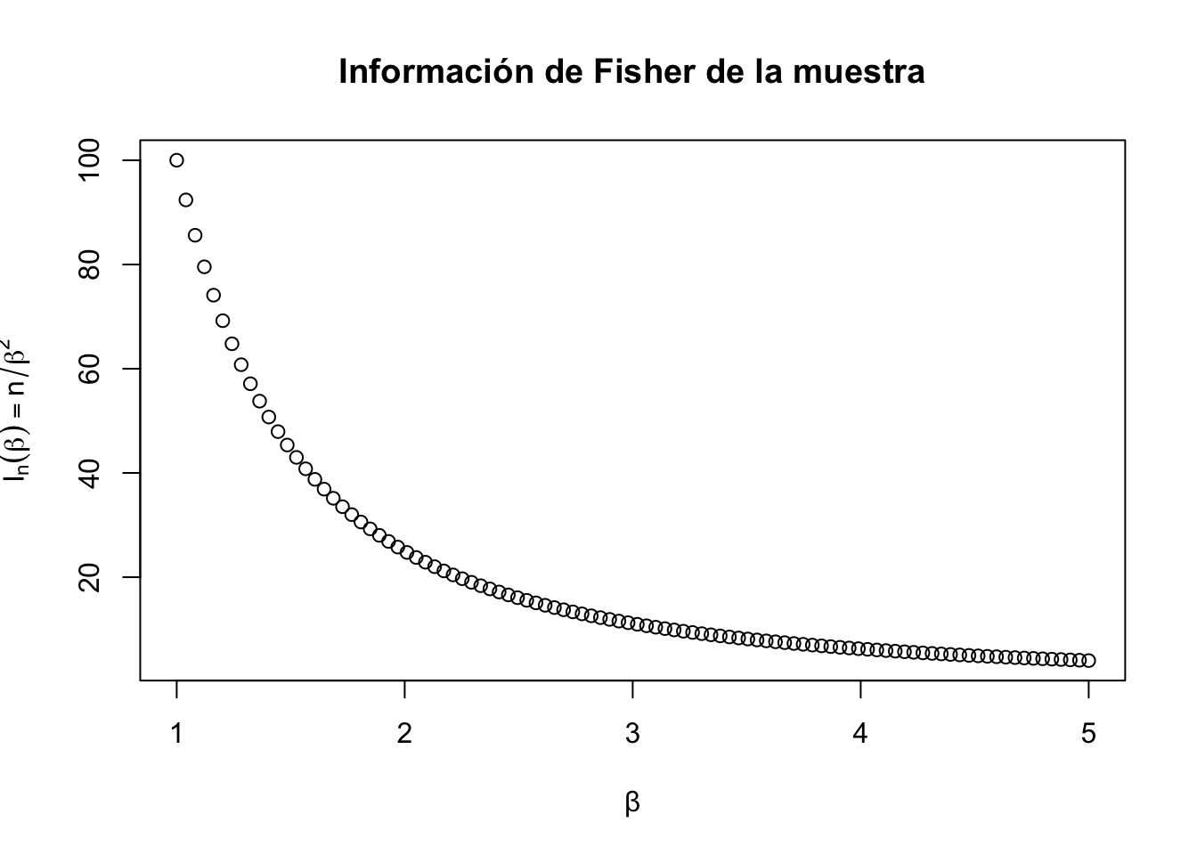 beta <-seq(1, 5, length.out =100)n <-100lista_muestras <-lapply(X = beta,FUN =function(b) {matrix(rexp(n = n *500, rate = b), nrow =500) })# I_n(β) = n/β² decrece cuando β creceplot(beta, n / beta^2,xlab ="β", ylab =expression(I[n](beta) == n/beta^2),main ="Información de Fisher de la muestra")