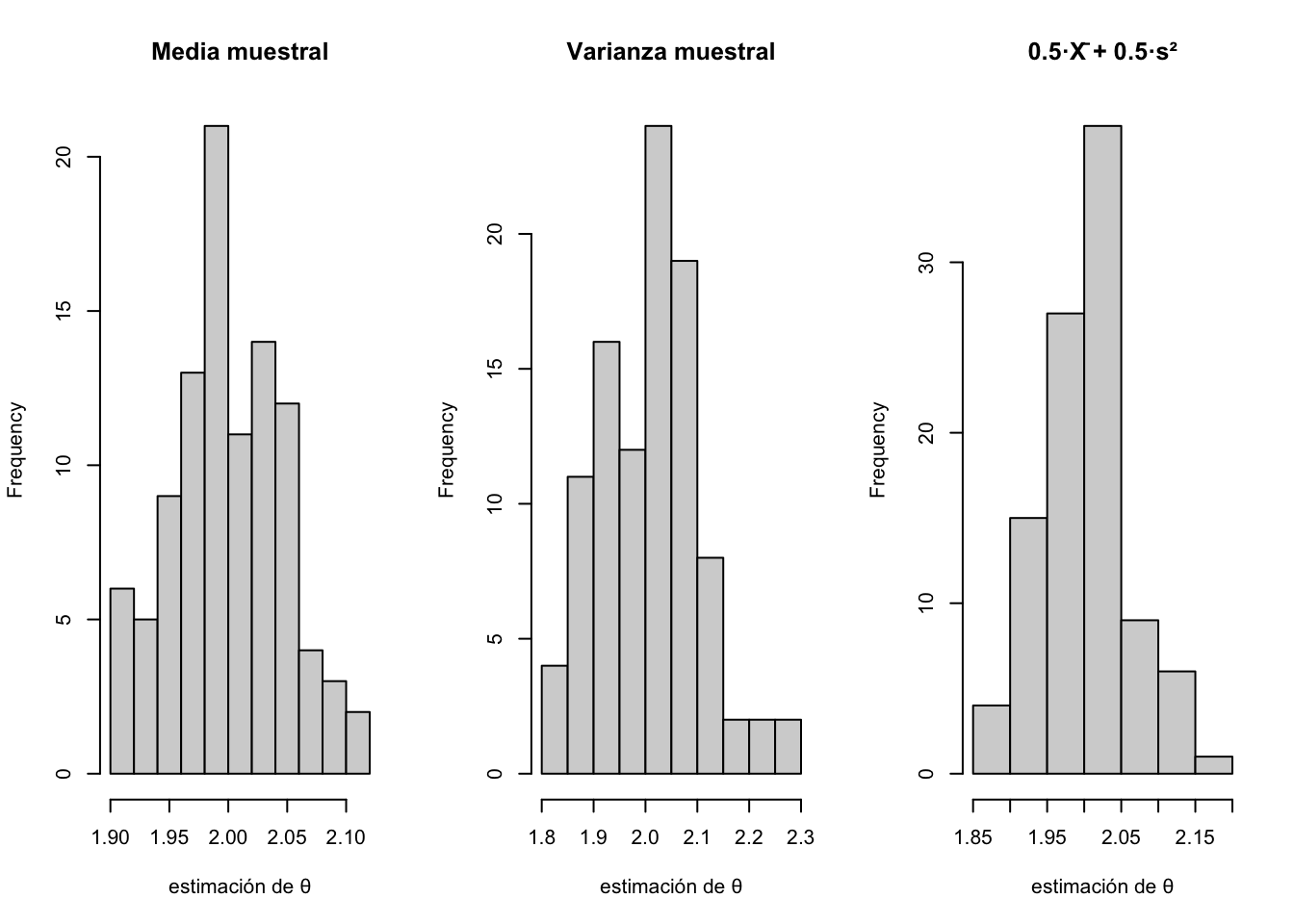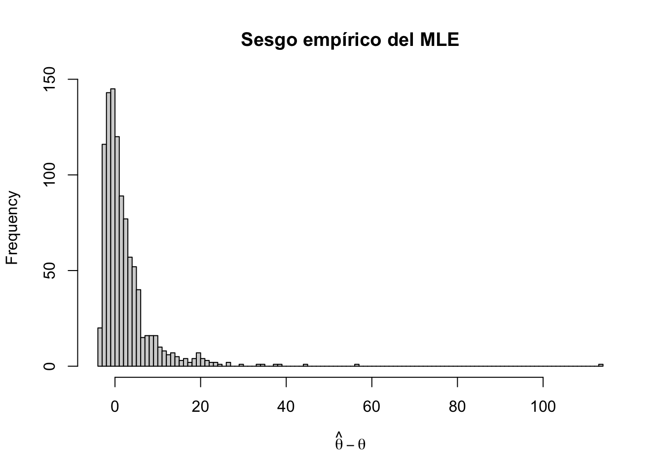 El histograma muestra la diferencia entre las estimaciones \(\hat{\theta}\) y el valor verdadero \(\theta\). Teóricamente, podemos calcular el sesgo de \(\hat{\theta}\) y encontramos que: