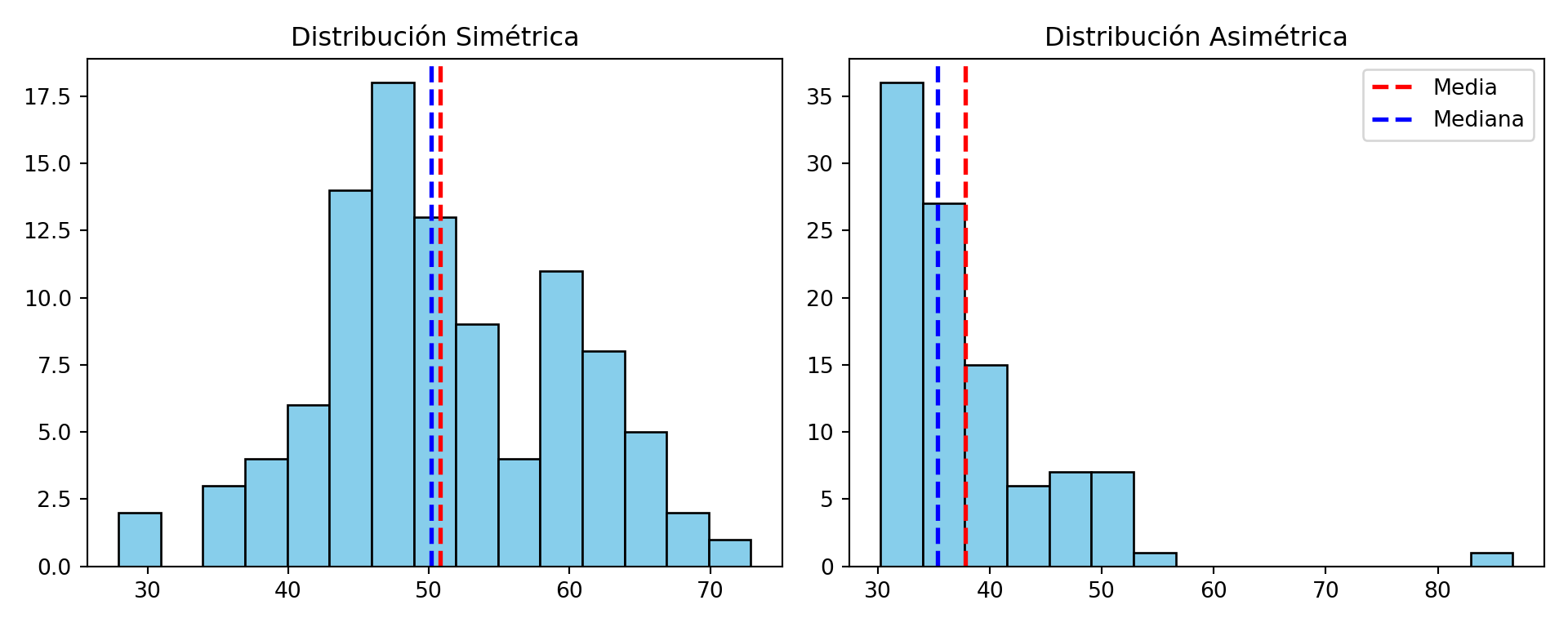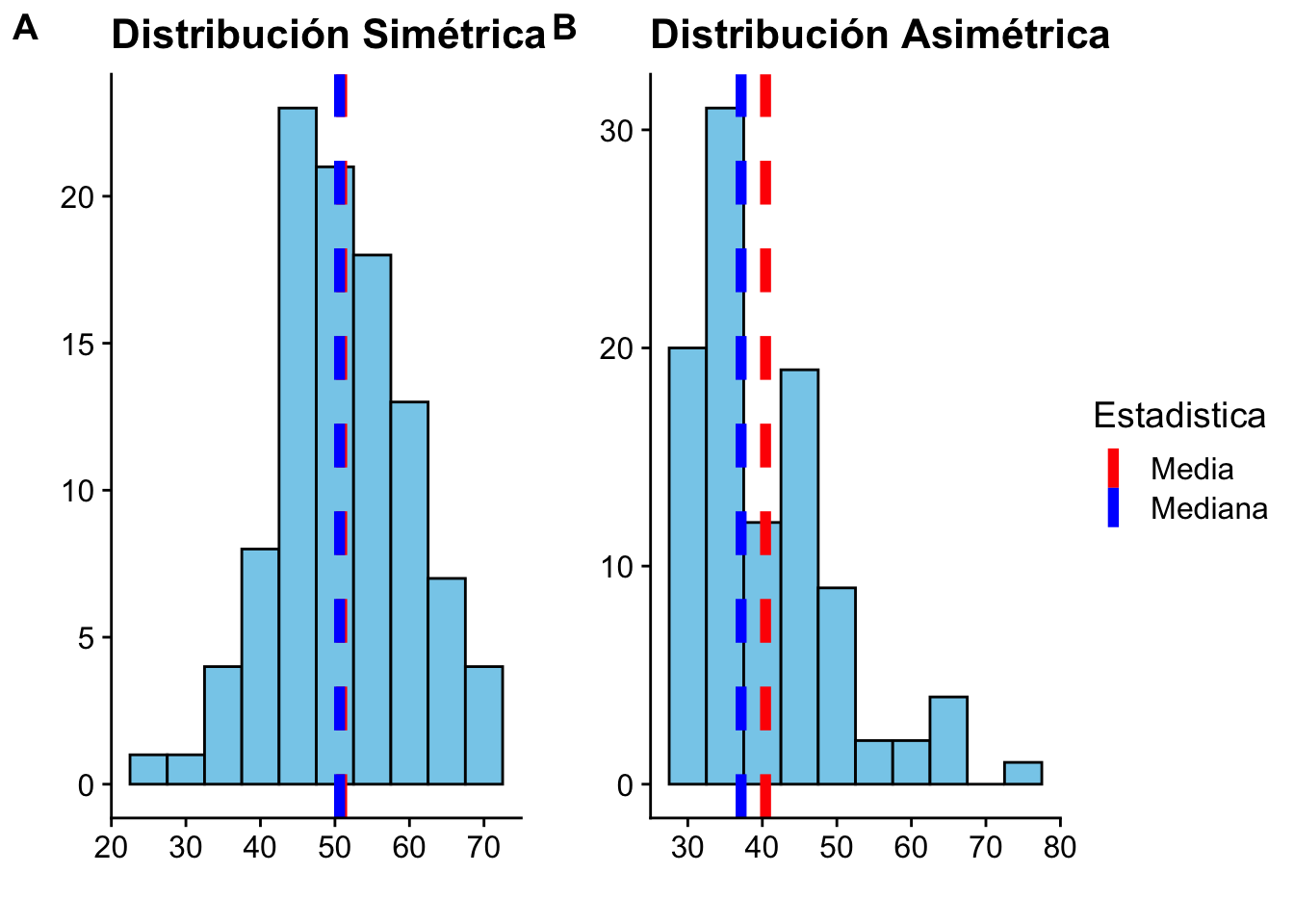 | Asimetría \(\hat{\gamma}_1\) | \(\frac{\frac{1}{n}\sum(x_i-\bar{x})^3}{s^3}\) | moments::skewness() |