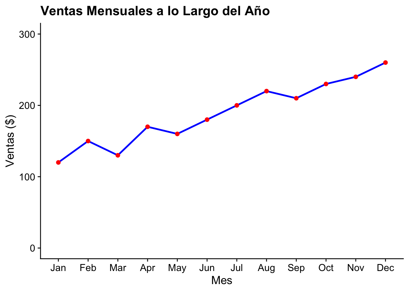 ggplot(ventas, aes(x = Mes, y = Ventas, group = 1)) +