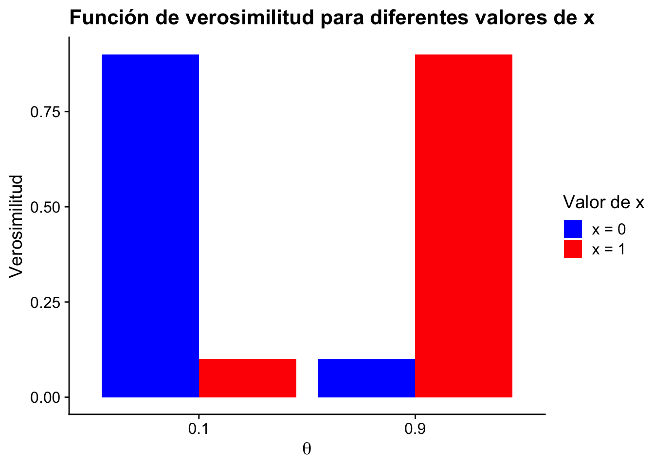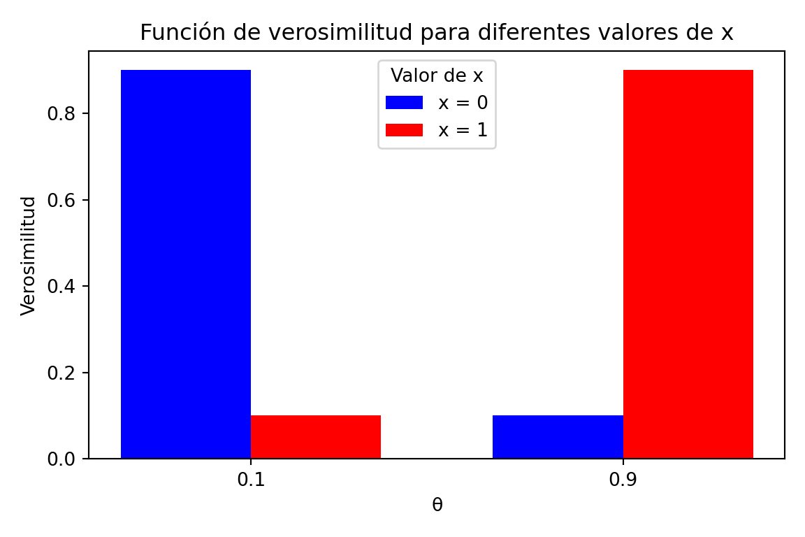 Si \(x=1\), entonces \(f(1\mid\theta) = \begin{cases}0.1 & \text{si }\theta = 0.1\\0.9& \text{si }\theta = 0.9\end{cases}\).