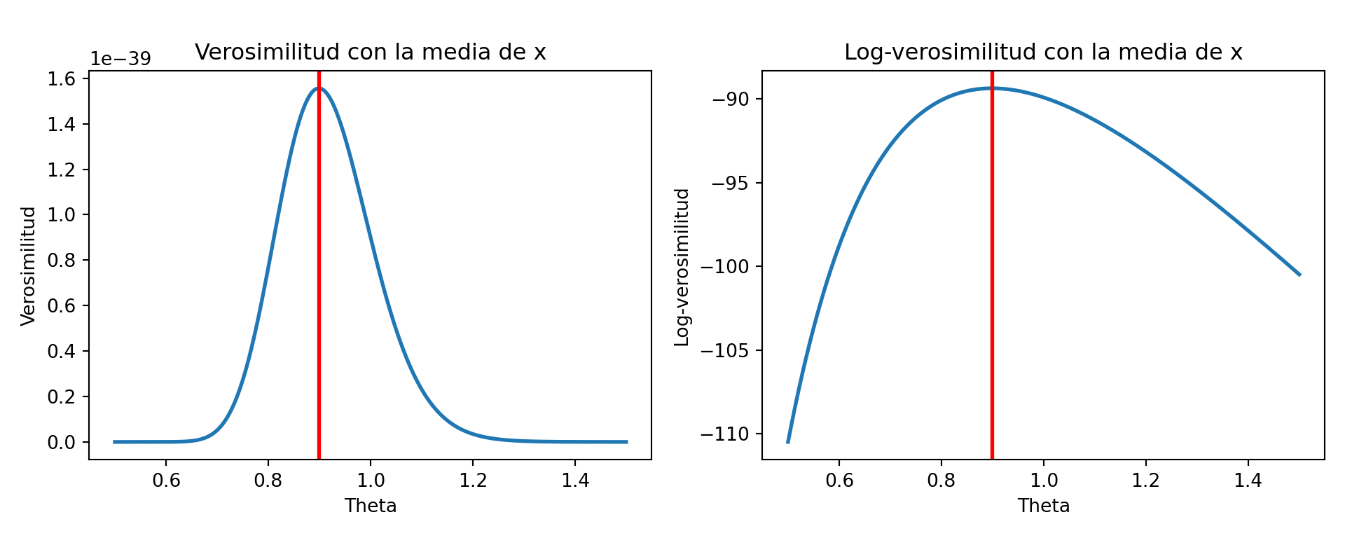 axes[0].set_title("Verosimilitud con la media de x")